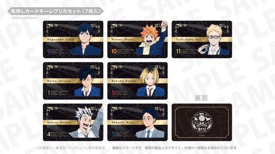 「【ハイキュー!!】頂ホテル コンセプトルーム宿泊プラン」あるいは「【ハイキュー!!】頂ホテル 通常客室プラン」にご宿泊いただいたお客様はフロントにて、描き下ろしビジュアルを使用した「オリジナルカードキーレプリカ(7枚セット)」をお買い求めいただけます。ご宿泊特典のカードキーレプリカはキャラクターが7名集合したデザインですが、こちらの商品は各キャラクターのデザインが1枚ずつ入った7枚セットで販売しております。