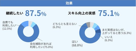 こうしたなか、スピーキングに特化して英語力を鍛えられる点や、場所や時間を問わず全国拠点で導入しやすい点から、2023年12月よりまずは6ヶ月間の先行導入を実施するに至りました。 その結果、実施後のアンケートでは87.5%の方が「継続したい」と回答したことに加え、75.1%の方が「英語のスキルが上がったと思う」と回答しました。