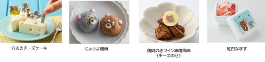 お正月ならではの伝統食材と洋風食材を盛り込みました。アニメに出てくるようなビジュアルの穴あきチーズケーキも一緒にお届けします。ケーキには付属のピックをデコレーションでき、見た目でも楽しめます。