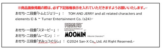 2025年度版のキャラクターおせちは、トムとジェリー85周年限定アートを使用した、周年イヤーだけのポップで可愛いおせち・二段重「トムとジェリー」、大人の女性からも人気の高いPEANUTSとコラボレーションしたおせち・一段重「スヌーピー」、可愛いキャラクターたちでお馴染みのすみっコぐらしをモチーフにしたおせち・三段重「すみっコぐらし」、さらに5年ぶりに復活したムーミンのおせち・二段重「ムーミン」の豪華全4種にて展開します。昨年の販売好調を受け、より多様化するお客様のニーズにお応えするためにキャラクターのバラエティを増やしました。