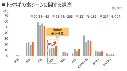 トッポギの食シーンは、以前は夕食中心でしたが、間食需要が増加しています。もちもちで腹持ちが良く一口サイズで食べやすいため、在宅ワークの小腹満たしや子どものおやつとして、スナック感覚で取り入れられていると考えられます。