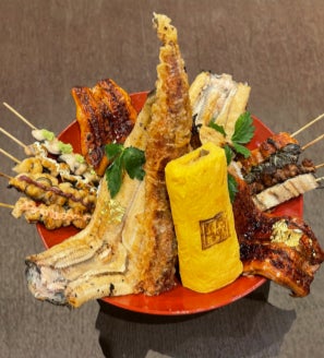 鰻の蒲焼が2尾、鰻の白焼きが2尾、鰻の天ぷらが0.5尾、その周りに鰻の肝やひれなどの串が9本並び、鰻を玉子で巻いたうまきが1本まるごと盛り付けられた超ボリュームのメニューです。