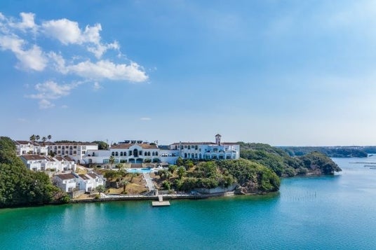 英虞湾に抱かれた真っ白な壁が青い空と海に映える外観