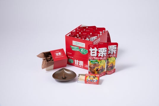 「甘栗むいちゃいました」は発売以来、焼きたてのホクホクとした自然な栗の甘さを提供してきました。小腹が空いた時、自然な甘さが欲しいとき、お出掛けの際などに。そんな「甘栗むいちゃいました」が、今回は「むかれちゃった皮」に着目。栗の皮を捨てずに再利用をすることで「栗皮から出来たお香」が誕生しました。甘栗を焼くときに、甘く香ばしい香りが漂いますが、お香も火をつけて香りが漂うという点で、親和性を感じたことがきっかけで今回の企画が生まれ、日本を代表する老舗の薫香メーカーである日本香堂様の協力を得て、コラボレーションが実現しました。