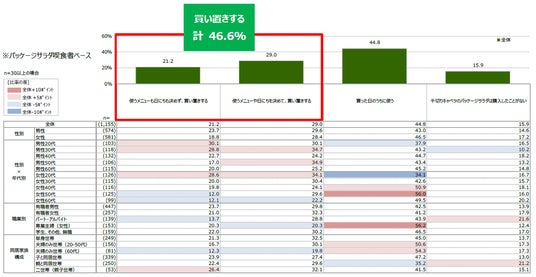パッケージサラダを1年以内に利用した人を対象に、「千切りキャベツ」のパッケージサラダの購入の際の使用タイミングについて尋ねたところ、「買い置きする」と答えた人(46.6%※)が、「買った日のうちに使う」(44.8%)を上回りました。「買い置きする」と答えた人は、男性20、30、50代、女性20代、二世帯(親子世帯)が他の世代に比べて高い結果となりました。
