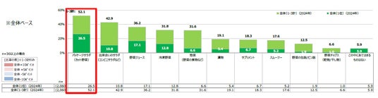 野菜不足解消に利用したい商品(1-3位計)は、「パッケージサラダ」(52.1%)が最も多く、「出来合いのサラダ」(42.9%)、「野菜ジュース」(36.2%)と続きました。2015年から同様の意識調査をするなかで、「野菜ジュース」が長年継続的に1位でしたが、2022年に初めて「パッケージサラダ」が抜き、今年で3年連続1位となりました。