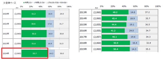 パッケージサラダの利用意向について尋ねたところ、55.7%と過半数の人が利用したいと答えており、同じ設問を開始した2013年以降最も高い結果となりました。