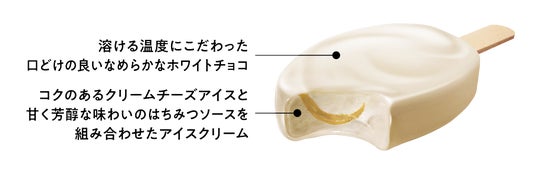 このたび発売する「PARM(パルム) ハニー&クリームチーズ」はコクのあるクリームチーズアイスの中に甘く芳醇な味わいのはちみつソースをマーブル状に充填し、口どけの良いホワイトチョコでコーティングしました。