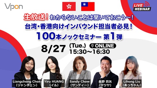 日本の魅力をデータ&デジタルの力で世界へ届けるクールジャパンDXカンパニーのVpon JAPAN株式会社(本社:東京都新宿区、代表取締役社長:篠原 好孝、以下Vpon JAPAN)は、2024年8月27日(火)に『生放送!わからないことは聞いておこう~!台湾・香港向けインバウンド担当者必見。100本ノックセミナー 第1弾』と題したオンラインセミナーを開催することをお知らせいたします。