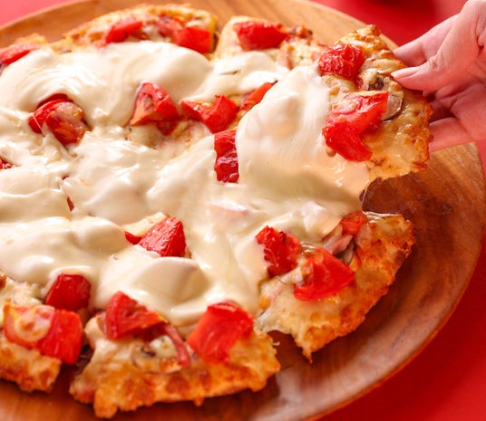 味もビジュアルも楽しさもインパクト大の『激盛りトマチーピザ』。チーズは厳選4種のナチュラルチーズをたっぷりのせ、さらに、かけてもつけても楽しい「とろ~りチーズ」を別添でお届け。また、フレッシュな食材を店舗で丁寧にカットして使用しているピザーラならでは、完熟のトマトを2個分もトッピングしています。