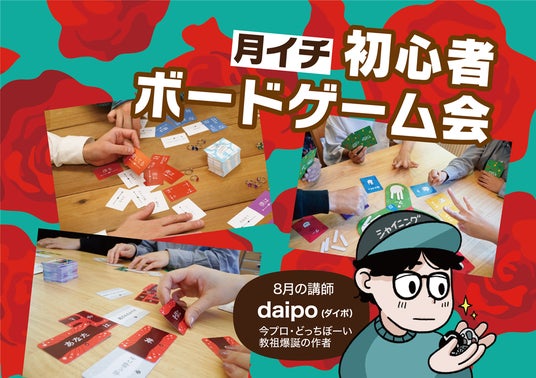 やってみたいボードゲームはあるけど、ルールブックを読んで理解するのにハードルを感じてしまう方でも安心。初心者ボードゲーム会では、ClaGlaのスタッフが講師としてゲームのルールを説明してくれます。8月の講師はシリーズ累計25万部突破のワードパーティゲーム『たった今考えたプロポーズの言葉を君に捧ぐよ。』の制作者 daipoが務めます。ボードゲーム制作者に直接ゲームのルール説明をしてもらえる機会をお見逃しなく!