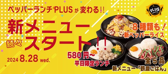 株式会社ホットパレット(本社:東京都江東区、代表取締役社長:松本純男)が運営するペッパーランチPLUSは、2024年8月28日(水)に、ペッパーランチの強みである「ペッパーライス」と、日常の食事シーンで利用しやすいメニューとして新たに導入する「鉄皿ごはん」の専門店としてメニューを大幅にリニューアルします。