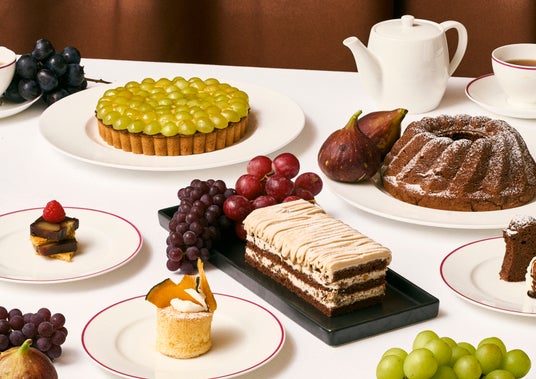 シャインマスカットタルトや栗ショート、イチジクチョコケーキなど、秋の味覚をふんだんに使用したスイーツ