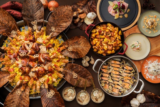 味覚だけではなく、チーズやキノコ、スモークなど秋ならではの芳醇な香りを愉しむことができるメニューをご用意いたしました。中でもひときわ目を引くのは、「ジャークチキンプロシェット・骨付き若鶏のロースト ジャンバラヤライス」(写真左側)で、カリブ海の島国「ジャマイカ」で愛されるスパイスの香りが効いたジャークチキンを豪快な骨付き若鶏のローストとジャンバラヤライスと共に提供いたします。