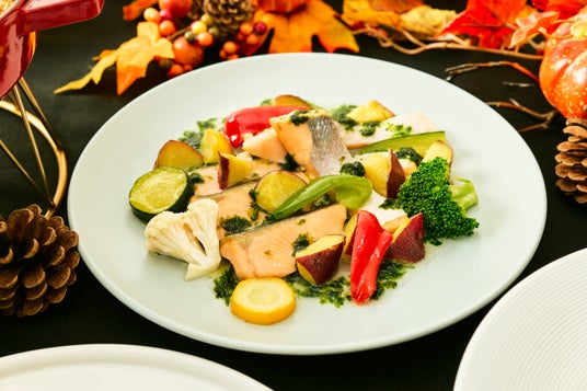 本格的な秋を迎える11月には秋の味覚の定番ともいえるサンマをニンニク、白ワインで煮詰め、粗くつぶしたトマトソースを絡めた「サンマとバジルのトマトソースパスタ」をはじめ、魚介のだし汁と海苔をまぜバターでとろみをつけたソースを旬の秋鮭に絡めた「秋鮭とサツマイモの海苔塩バターソース」など、秋の味覚をふんだんに使用した彩り豊かな食体験をお愉しみいただけます。