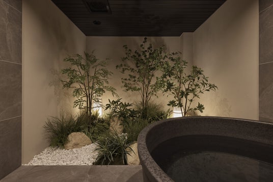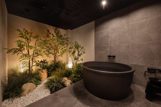 「和」をコンセプトにした今回の施設最大の特徴は、寝室内に併設する庭園付きの壺風呂。光を抑えた落ち着いた雰囲気の中で「和」を体感していただけます。庭園内には竹細工の照明を設置。間接的な照明により一層リラックスできる空間に仕上げました。