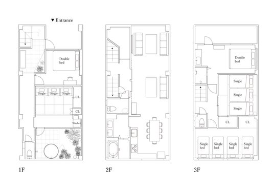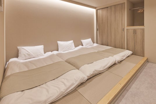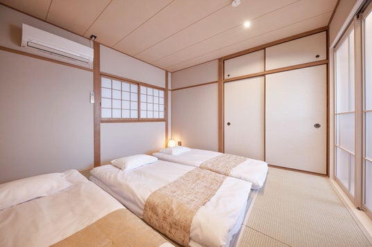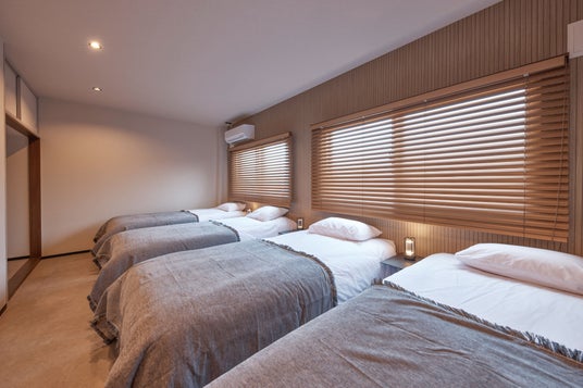 寝室は合計で5部屋あり、最大20名までの宿泊が可能です。洋室だけでなく和室も用意しているので、小さいお子様やベッドが苦手な方も安心です。(1F/洋室1:ダブルベッド1台,和室1:布団3組 2F/リビング:ダブルサイズソファベッド3台 3F/洋室2:ダブルベッド1台,和室2:布団3組,洋室3:シングルベッド4台)