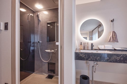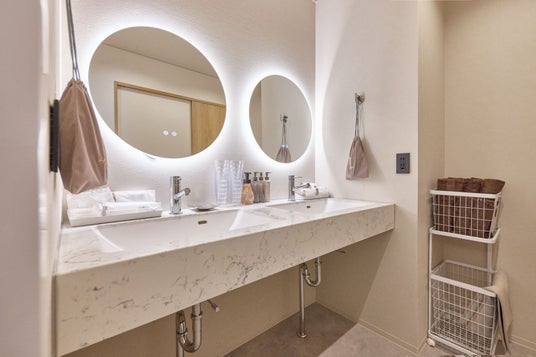 洗面化粧台は2階と3階の2か所に設置。うち1か所はシャワールームと共に主寝室内に設置されており、プライベートな使用も可能です。各種アメニティも充実したラインナップで用意。ハンドソープだけでなくクレンジングや化粧水乳液はすべてPOLAで統一されています。ミラーや洗面ボウル含め部屋のインテリアになじむようセレクトしました。