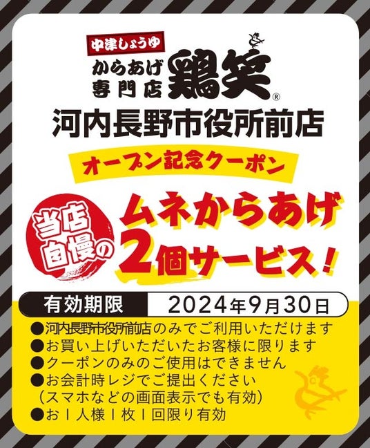 鶏笑 河内長野市役所前店のオープンを記念して、河内長野市役所前店限定で「ムネからあげ2個」がもらえるクーポン券を、数量限定で店頭などでお配りしています。以下のクーポン画像をスマートフォン等でご提示いただいても有効です。皆様のご来店をお待ちしております!