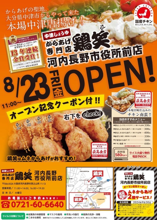 からあげ専門店「鶏笑 河内長野市役所前店」2024年8月23日(金)オープン!