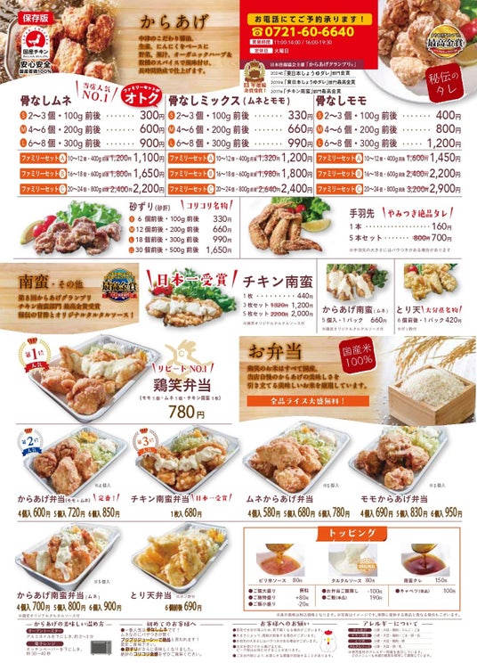 この度オープンいたします「鶏笑 河内長野市役所前店」は、南海高野線 河内長野駅から徒歩20分(南海バス 河内長野市役所前から徒歩1分)のところにあります。ご注文はお電話から事前にご連絡いただければ、お待たせすることなく商品をお渡しできます。昼食のお弁当、晩御飯のおかずやお酒のおつまみなど、毎日のお食事の中で、最高金賞受賞のからあげのおいしさをご堪能下さい。