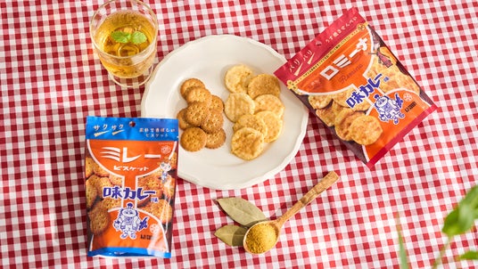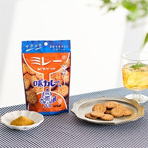 「味カレー」のオリジナルスパイスの風味がいっぱいに広がる、新しくもレトロな味カレー味のミレービスケットとロミーナをお楽しみください。