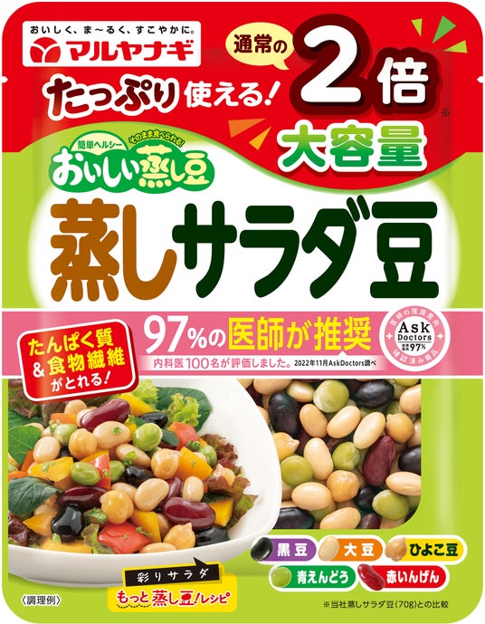 「おいしい蒸し豆」シリーズは、毎日の食事に不足しがちなたんぱく質や食物繊維をプラスオンできる商品として、たくさんのお客様にご愛顧いただき成長してまいりましたが、この度、シリーズでも最も人気の高い蒸しサラダ豆を通常の2倍の内容量にした「おいしい蒸し豆 大容量 蒸しサラダ豆」を発売することで、より「たっぷり使いたい」というお客様の声にお応えできると考えました。