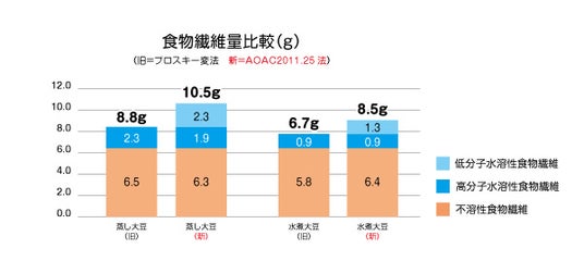また、大豆の食物繊維については、これまで不溶性食物繊維が中心とされてきましたが、新しい分析法(AOAC2011.25法)において低分子水溶性食物繊維が分析可能となり、「大豆は食物繊維量が多く、かつ不溶性も水溶性食物繊維も含まれる」ことが明らかになりました。日本食品標準成分表2020版(八訂)より、新しい分析法による食物繊維量の掲載が始まり、蒸し大豆は水煮大豆と比較して水溶性食物繊維が1.9倍も含まれていることが分かりました。