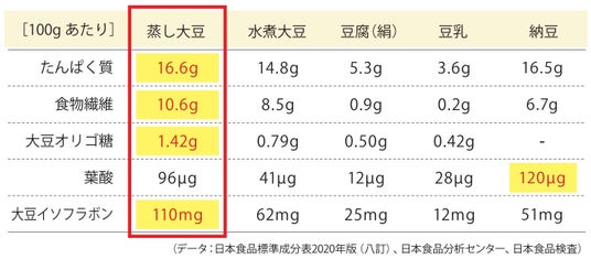 ※日本食品分析センター調べ(蒸し大豆:マルヤナギ小倉屋)、水煮大豆:日本食品標準成分表2020版(八訂)黄大豆・ゆで