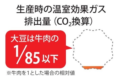 蒸し大豆は環境にもやさしい食材。大豆は牛肉と比較して、1kgの生産に必要な水の量は1/8以下、生産時に排出する温室効果ガスは1/85以下です。蒸し大豆を毎日の食生活に取り入れることが、持続可能な食糧生産システムの一環として、地球への貢献につながるのです。