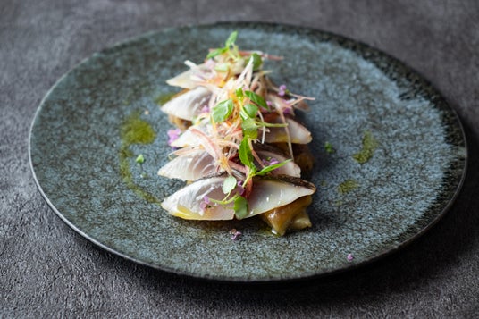 〆サバの炙りと秋ナスのタルタル仕立て 1,600円じっくり焼いて甘みを引き出した地茄子を、特製の茄子ソースで和えた一品。若狭湾から仕入れた鯖を使った、自家製のしめ鯖と共に召し上がりください。