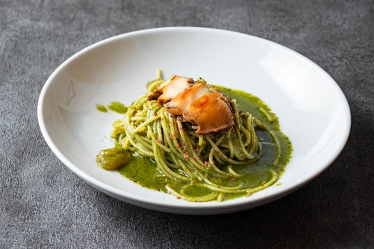 アワビと冬瓜、大葉ジェノベーゼ 2,500円ニンニクやチーズを使用せず、大葉の香りを主役にした和パスタ。トッピングに蒸しアワビと、フリーズドライの梅を散らし、色合いと味わいのアクセントに。