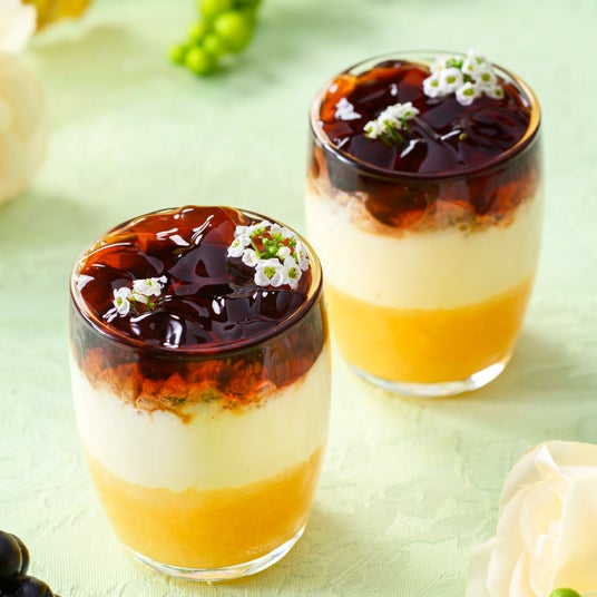シャインマスカットと白ワインのジュレを濃厚なプリンに合わせました。