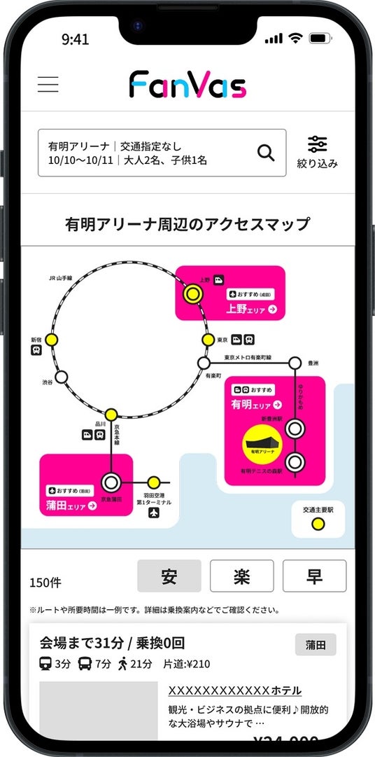 コンサートやイベント遠征時、土地勘のない地域でお客さまがどのエリアに泊まればいいのかわからない課題を解決するため、「FanVas」はイベントに特化したホテル予約サイト構成としています。会場だけでなく新幹線や空港にもアクセスしやすいエリアを明示し、ホテル提供を行います。会場と交通手段(新幹線、空港、その他)を選ぶと、おすすめのエリアがイラストマップ表示されるほか、新幹線、空港の到着駅からホテル、ホテルから会場までの行き方をホテル一覧と共に表示します。