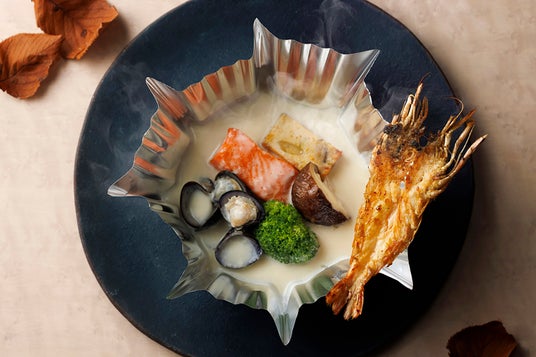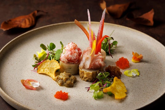今回は、雄大な鳥取砂丘を有し、北は日本海、南は中国山地という豊かな自然に囲まれた鳥取県にフィーチャー。シェフが実際に現地に訪れ、厳選した食材の魅力をアイデア光るお料理でご堪能いただきます。冷前菜には、秋が旬の「ベニズワイガニ」をマリネし、郷土料理の「とうふちくわ」に合わせた一品でご用意。温前菜には、鳥取県が誇るオレイン酸を55%以上含むブランド牛「鳥取和牛 オレイン55」のリブロースを薄くスライスし、鉄板で軽く焼いて寿し風に。山葵本来の香りと辛味が特長の「山葵油」でお楽しみください。魚料理は、地元でしか味わえないとされてきた「モサエビ」をポワレし、「ヤマトシジミ」と「とっとり琴浦グランサーモン」入りの「白バラ牛乳」のチャウダーに添えてご提供。モサエビの旨味と濃厚なチャウダーが調和した至福の一品です。サラダには、こだわりのミディトマトを作る井尻農園の「花咲姫」を入れ、凝縮した甘さと適度な酸味が箸休めになります。メインディッシュには、「鳥取和牛 オレイン55」のサーロインを「かぼす胡椒」と「藻塩」で、温前菜とは異なる肉の旨味をご賞味ください。また、鳥取づくしのコースに合わせて、地酒などのドリンクもセレクトいたしております。