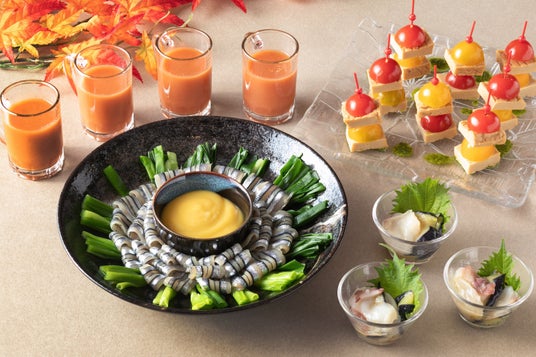 熊本県名物とうふの味噌漬けのカプレーゼ風/熊本県産トマトのガスパチョ風/