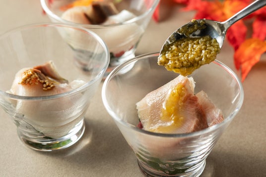 熊本県産きびなごとわけぎのからし酢味噌/天草ぶりのしゃぶしゃぶ2種のソースで/