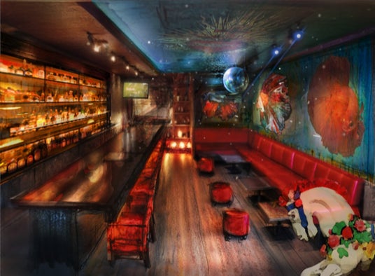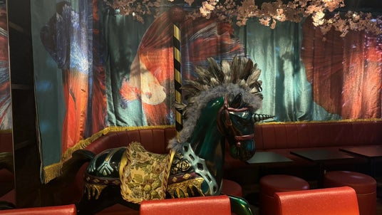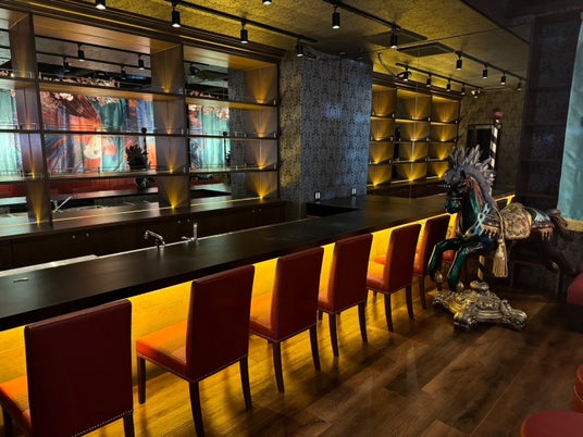 東京店の非現実を継承した店内は、熱帯魚の"ベタ"が描かれた色鮮やかで大きなカーテンにミラーボールの光が煌めく空間が印象的です。