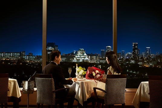 大阪の夜景と大阪城天守閣が見守る中、ロマンティックなアニバーサリーディナーを