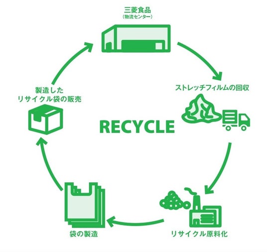 当社は、三菱食品株式会社様(本社:東京都文京区)と地球環境保護を目的としたプラスチック循環リサイクルに取り組んでいます。三菱食品株式会社様の物流センターより、使用後不要となったストレッチフィルムを回収し、当社の尼崎プラスチックファクトリー(兵庫県尼崎市丸島町)にてリサイクル原料を製造し、生まれ変わったリサイクルゴミ袋を再度同社の物流センターに納め再利用するという、環境に配慮したリサイクルループの取組を展開しております。