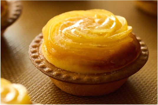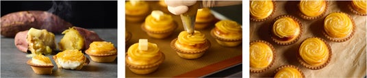 今秋のシーズナルチーズタルト第1弾は、秋の味覚であるさつまいも。その中でも、特に甘みが強い品種“紅あずま”を主役にした限定商品です。チーズムースの上に“紅あずま”クリームを絞り、仕上げにバターを乗せて焼きあげています。程よい塩味の効いた濃厚でコク深いバターが、秋の豊かな味覚をより一層引き立てます。ご自宅のオーブンで、少し焦げ目が付くぐらいを目安に1~2分ほど焼くと、バターの香ばしさが広がり、より一層美味しくお召し上がりいただけます。
