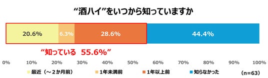 飲食店従事者に「酒ハイ」を知っているかと尋ねたところ「知っている」との回答が約6割(55.6%)と過半数を超える結果となりました。ただ、「知っている」と回答した約6割のうち、「最近」知ったとの回答が約2割(20.6%)かつ、「知らなかった」が全体の4割強(44.4%)あることを踏まえると、お酒を提供する飲食店においても「酒ハイ」は比較的新しく、これから浸透していく飲み方だと言えます。