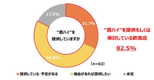 「酒ハイ」の提供状況、今後の提供意向について伺うと「提供している・予定がある」が約3割(31.7%)、「機会があれば提供したい」が5割(50.8%)と提供に前向きな割合は8割(82.5%)を超える結果となりました。