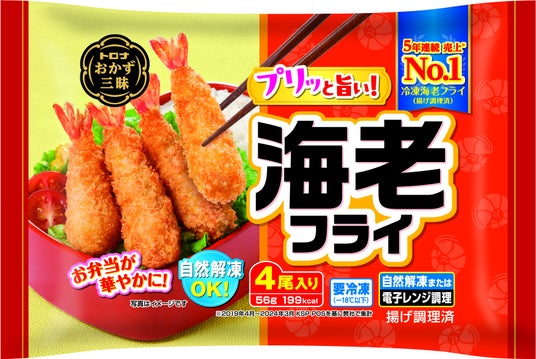 冷凍海老フライ(揚げ調理済)売上No.1※。サクサク感がアップした衣とプリッとした海老でサクプリ食感をより楽しめるようになりました。しっぽ付きのためお弁当が華やかに仕上がります。自然解凍でもお召し上がりいただけます。