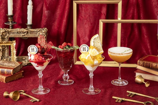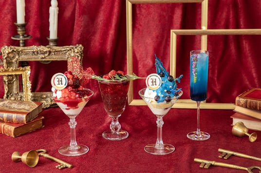 2024年8月30日(金)より順次期間限定で提供開始の新メニューは、4寮をイメージしたノンアルコールカクテルと、2種のアイスをのせ、カラフルなソースで仕上げたパフェで、どのメニューも思わず写真に撮りたくなるフォトジェニックで華やかなスペシャル感溢れるメニューとなっています。また、ドリンクとパフェのセットメニューやグッズなどもご用意いたしました。