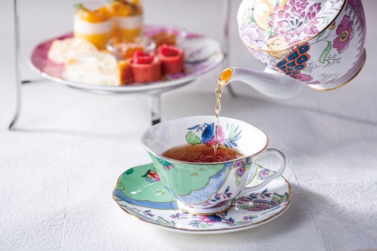 美しい色と柄で心おどるウェッジウッド「バタフライ・ブルーム」シリーズのティーセットで提供するAFTERNOON TEA with “SIROCCO”。実りの秋は味覚の宝庫。中でも際立つシャインマスカットとマロンをふんだんに取り入れました。セイボリーは鹿児島県産ハチミツ芋をハモンセラーノと合わせたピンチョスがおすすめ。スイーツは大粒のシャインマスカットがトップを飾る「シャインマスカットパフェ」やマロンクリームのマカロンなど、シャインマスカットとマロンのどちらから先に食べようか迷ってしまうラインナップです。