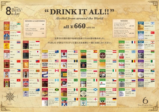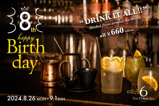 今年は4年に1度の世界的なスポーツの祭典が開催された年。この特別な年にちなみ、8周年特別ウィークでは、世界50各国のアルコールドリンクにスポットをあて「“DRINK IT ALL!!”~Alcohol from around the World~」を企画。シックスの“6”にこだわった特別価格の「ALL¥660」で販売いたします。世界各国のアルコールドリンクに出会える機会をお見逃しなく。