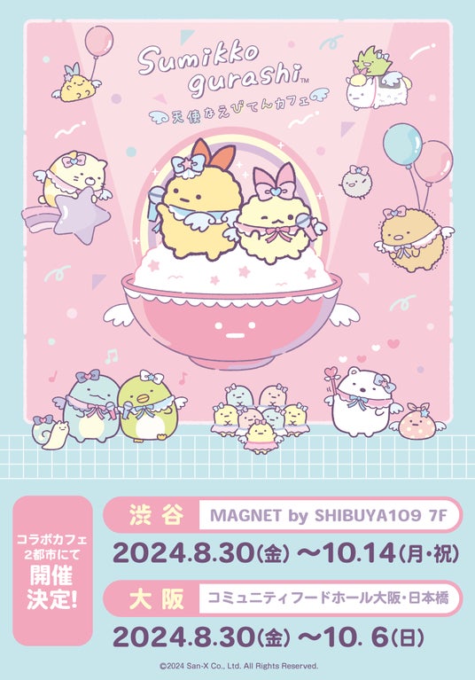 サンエックス株式会社(本社:東京都千代田区)は、すみっコぐらしの新キャラクター「えびてんのしっぽ」の登場を記念し、2024年8月30日(金)より、渋谷・大阪にて『天使なえびてんカフェ』が開催されることをお知らせします。