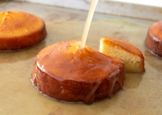 大量のシロップをぶっかけられているバターケーキ