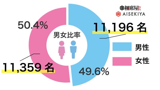 2024年7月の相席屋への男性来店数は11,196人、女性来店数は11,359人を突破。男性49.6%、女性50.4%でした。また、男性来店数のうち初めて来店した男性は3,727人、2回以上来店した男性は7,469人、女性来店数のうち初めて来店した女性は4,041人、2回以上来店した女性は7,318人でした。